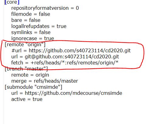 6.在自己倉儲內的對應git目錄中的config,更改連線協定, 由 https 改為採 ssh 連線