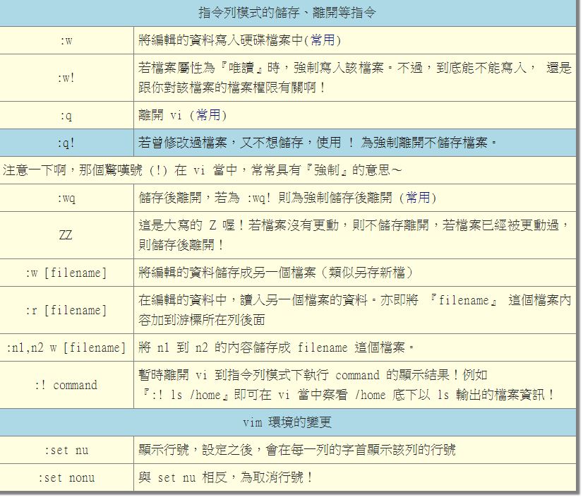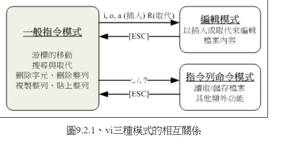 2.在一般指令模式中可以進行刪除、複製、貼上等等的動作,但是卻無法編輯文件內容的! 要等到你按下『i, I, o, O, a, A, r, R』等任何一個字母之後才會進入編輯模式。注意了!通常在 Linux 中,按下這些按鍵時,在畫面的左下方會出現『 INSERT 或 REPLACE 』的字樣,此時才可以進行編輯。而如果要回到一般指令模式時, 則必須要按下『Esc』這個按鍵即可退出編輯模式。