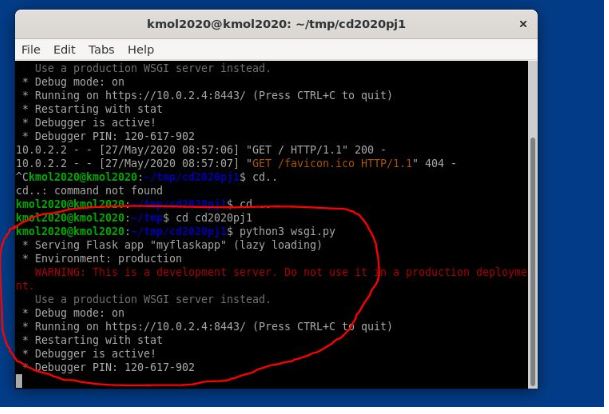 5.進入虛擬主機內tmp/cd2020pj1,由python3 wsgi.py啟動cline端