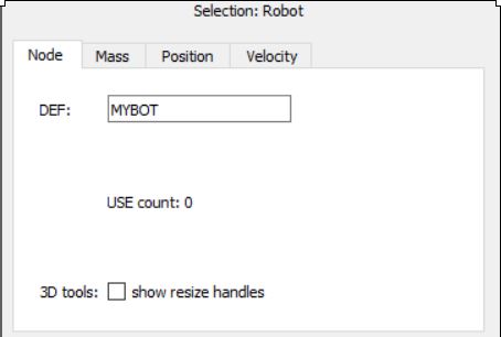 此外,如果當前選擇是Robot節點(或後代,或PROTO基於Robot的實例),則可以在文本編輯器中打開相應的機器人窗口或打開機器人的控制器。